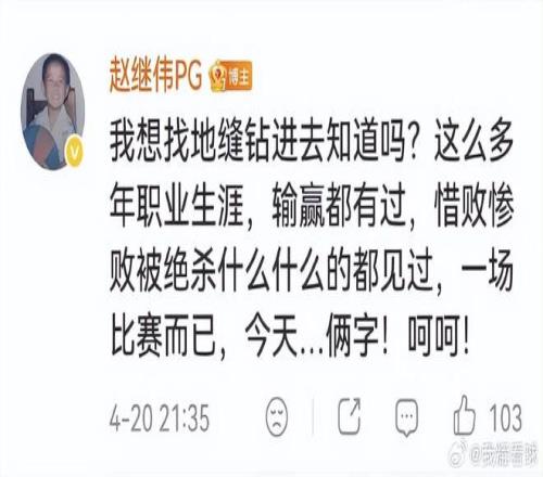 本場(chǎng)比賽遼寧國內(nèi)球員只有趙繼偉一人得分上雙,16分鐘9中5,拿到11分和4個(gè)助攻,應(yīng)該說他的進(jìn)攻效率是較高的了。也許是趙繼偉看到隊(duì)友太無能,輸?shù)貌桓市模雅鸢l(fā)泄給隊(duì)友。賽后他在媒發(fā)了小作文,表達(dá)了不滿,他生氣地說,“我想找地縫鉆進(jìn)去知道嗎?這么多年職業(yè)生涯,輸贏都有過,惜敗慘敗被絕殺什么什么的都見過,一場(chǎng)比賽而已,今天...倆字!呵呵!”這通話,顯然是說給隊(duì)友聽的,噴隊(duì)友不中用,什么方式輸球都見過了,唯一不像今天輸?shù)眠@么可恥和不甘。