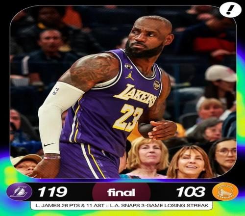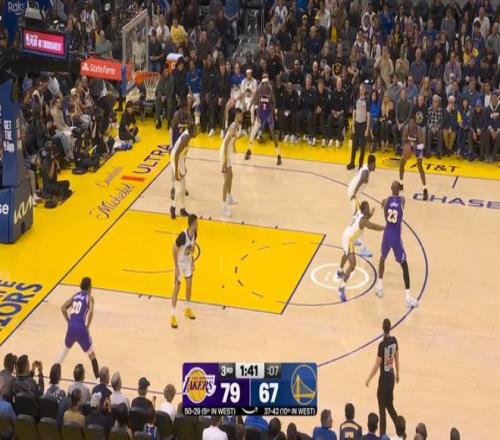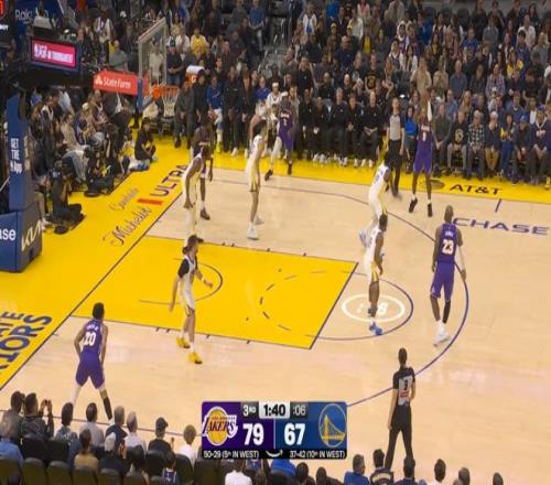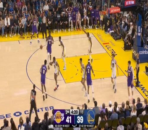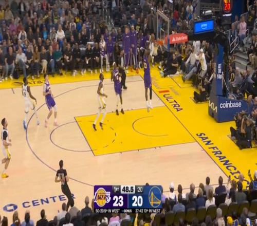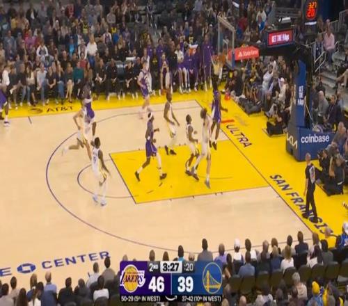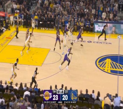 其中第一節,詹姆斯就單節7中5,拿下了12分,期間幾次打成背打和三分;三節結束時,詹姆斯已經得到20分4籃板6助攻,湖人也以82-73領先勇士。