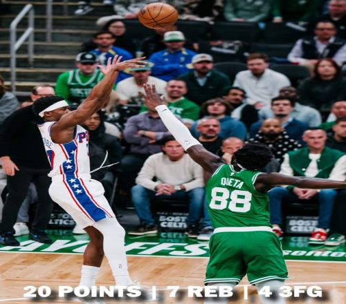 76人隊的埃奇庫姆上半場得到20分,馬克西得到15分,喬治得到9分;凱爾特人隊的布朗得到15分,塔圖姆得到12分。