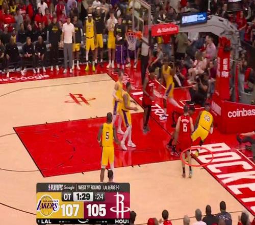 第二次漏判發(fā)生在距離加時賽結(jié)束還有1分29秒。裁判報告指出,詹姆斯在與火箭球員拼搶時拿到球,但這時他的腳已經(jīng)出界,裁判沒有響哨。雖然這一球理論上是湖人獲利,但詹姆斯救球回來,火箭又得到球權(quán)。這一漏判的影響,對比賽來說沒有上一次那么明顯。